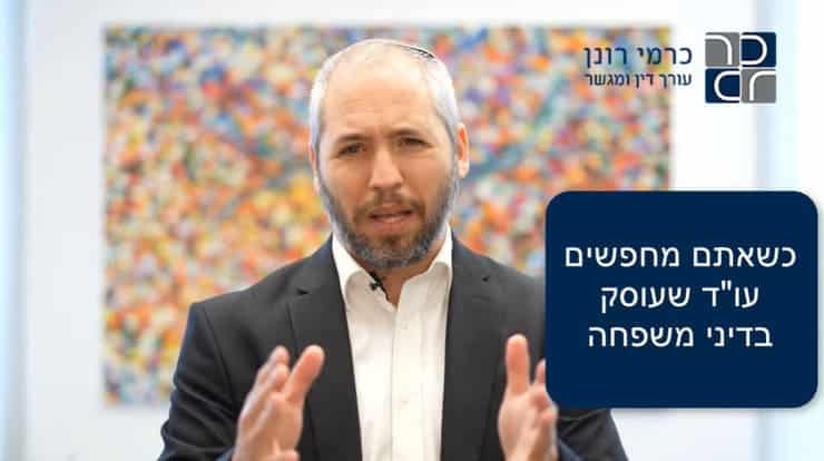 פורסם ב- אמיתי אורן מגשר נהדר. מקצועי ורגיש. מביא לסיטואציה מורכבת מאוד גם הרבה ידע וניסיון וגם תבונה אנושית שכל כך חשובה בתהליך כזה. ממליץ בהחלטפורסם ב- אריאל ניזרי לפני היותו עורך דין משובח, הגון, קר רוח, ומקצוען. מדובר באדם נעים הליכות כנה, וזמין ללקוח בתקופה שדורשת ליווי והקשבה. אדם מקסים שמביא המון כבוד למקצוע, ונותן תמורה. מומלץ ביותר!פורסם ב- רונן בן דוד עו"ד כרמי רונן הוא אדם מיוחד. זמין, מקצועי מאיר פנים, מרגיע, משתף והכי חשוב, נותן ללקוח את העצה הטובה ביותר. אני רוצה להודות לו מקרב לב על הייצוג בתיק ובייחוד על הסיום המתוק שבו יצאנו כאשר ידינו על העליונה.פורסם ב- שמוליק עו"ד כרמי רונן ליווה אותי בתהליך גירושין קשה מאוד מבחינה רגשית, אך מהיר. השקט שהקרין, הזמינות שלו אלי והנכונות שלו לעשות עבורי כלקוח מעל ומעבר סייעו לי לעבור את התהליך הקשה הזה בהצלחה.פורסם ב- רחלי חזן עו"ד מס' 1, הכי טוב שיש! ממליצה בחום על עו"ד כרמי רונן, שליווה אותי במשך 5 שנים בהליך ארוך, מייגע ומורכב מאוד, שכלל דיונים רבים בבית הדין ומעורבות בנושאים נוספים מעבר לענייני משפחה. ועשה זאת בצורה נפלאה, במקצועיות רבה, עם מלא סבלנות, אדיבות, יושר והגינות לכל הצדדים והתוצאה הייתה מדהימה בפסק דין. בנוסף, ליווה אותי עו"ד כרמי, בערעור שהוגש ברבני הגדול וגם כאן הייתה הצלחה גדולה ותוצאה מעולה. במהלך כל השנים, תמיד הפניות אליו נענו בצורה אדיבה, בסבלנות ובמקצועיות רבה. מרגישה שזכיתי בלוטו שבחרתי בעו"ד כרמי רונן, פשוט מלאך, עם כל התכונות הטובות שקיימות באדם וכל כך נחוצות במצבים כה רגישים. ממליצה מכל הלב.פורסם ב- eliya shemer קיבלתי ליווי מסור ורגיש, מקצועי ויעיל. פועל ביושרה ובחוכמה והכל בדרכי שלום ונועם מקסימליים, מה שלי היה חשוב מאד.פורסם ב- zvi hirsch טיפול מקצועי אדיב .פורסם ב- דפנה כץ עורך דין כרמי, אישיות נעימה וקשובה. לצד האנושיות, יש את המקצועיות רבת הערך! סבלנות, מהירות פעולה . אני עברתי חוויה מתקנת. ממליצה בחום רב! בברכה . דפנה כץ.